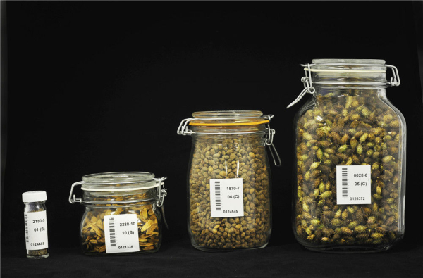 打開冷庫門,寒氣撲面而來。架子上整齊擺放著玻璃瓶,種子按體積大小入瓶,再放進(jìn)密封罐。瓶子上的條碼,標(biāo)明種子入庫位置和種質(zhì)信息。每個(gè)物種的種子被分為兩份,分別存放在備份庫和活動(dòng)庫中,前者永久保存,后者做萌發(fā)試驗(yàn)?!懊扛?年或10年,我們會(huì)抽樣進(jìn)行萌發(fā)實(shí)驗(yàn),看看種子是否還有活力?!狈N子萌發(fā)管理員楊娟說。