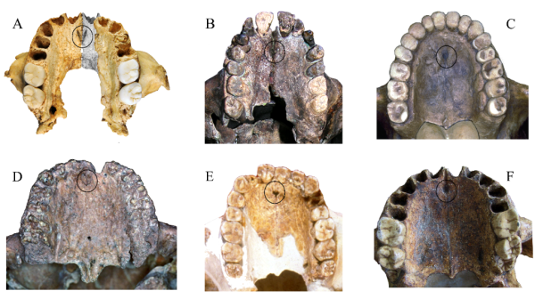 華龍洞6號(hào)與部分古人類化石硬腭部門齒孔位置。(A)華龍洞6號(hào); (B)非洲直立人; (C)周口店直立人; (D)摩洛哥中更新世晚期早期現(xiàn)代人; (E)金牛山人; (F)山頂洞人(中科院古脊椎所供圖)
