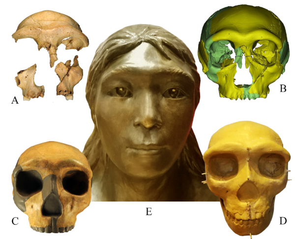 華龍洞6號(hào)頭骨面貌復(fù)原:(A)華龍洞6號(hào)化石;(B)虛擬復(fù)原頭骨;(C)實(shí)體復(fù)原頭骨;(D)雕塑頭骨;(E)復(fù)原像(中科院古脊椎所供圖)