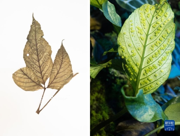 這是10月10日在昆明植物園拍攝的天星蕨。這張拼版照片分別為科研人員野外采集的標(biāo)本(左)和在植物園遷地保護(hù)后存活下來的同種植物。新華社記者 金立旺攝