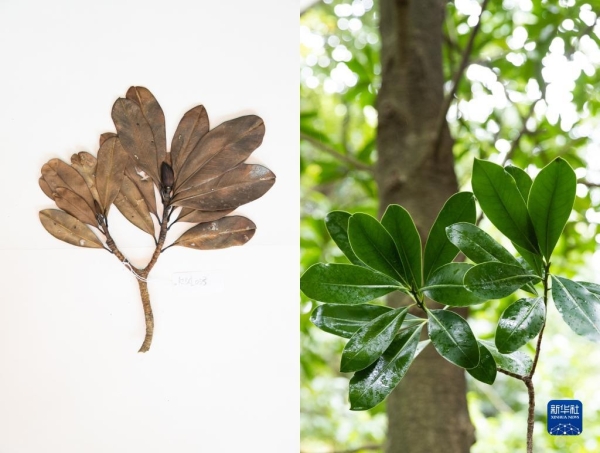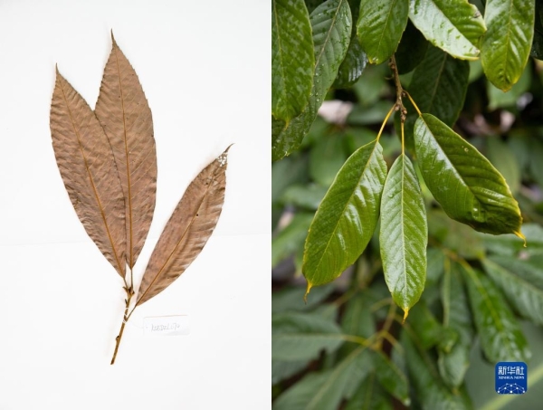 這是10月10日在昆明植物園拍攝的西疇青岡。這張拼版照片分別為科研人員野外采集的標(biāo)本(左)和在植物園遷地保護(hù)后存活下來的同種植物。新華社記者 金立旺攝