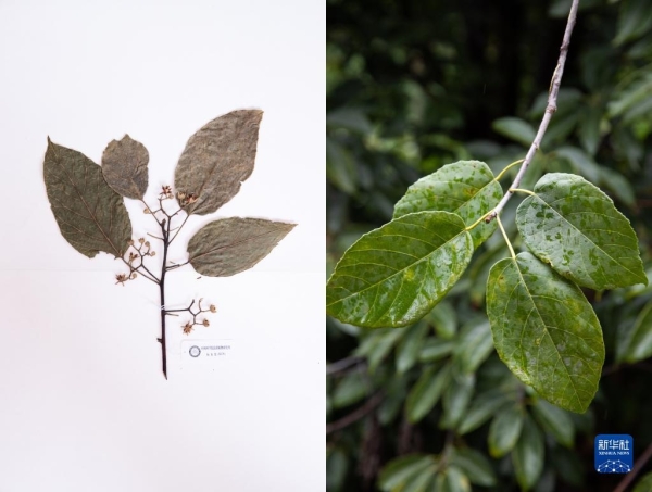 這是10月10日在昆明植物園拍攝的滇桐。這張拼版照片分別為科研人員野外采集的標(biāo)本(左)和在植物園遷地保護(hù)后存活下來的同種植物。新華社記者 金立旺攝
