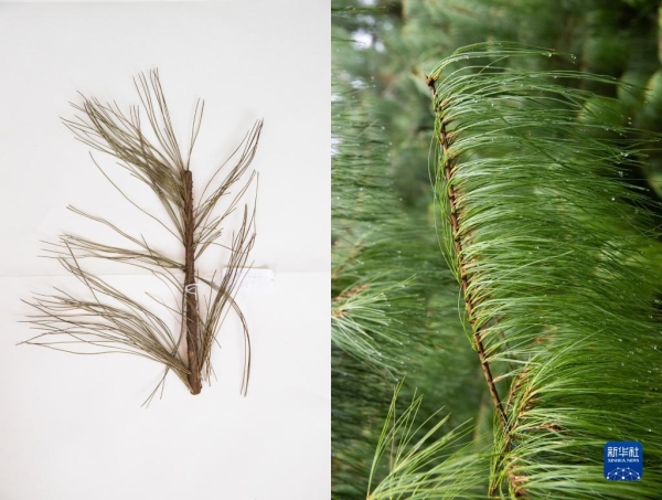 這是10月10日在昆明植物園拍攝的巧家五針?biāo)?。這張拼版照片分別為科研人員野外采集的標(biāo)本(左)和在植物園遷地保護(hù)后存活下來的同種植物。新華社記者 金立旺攝