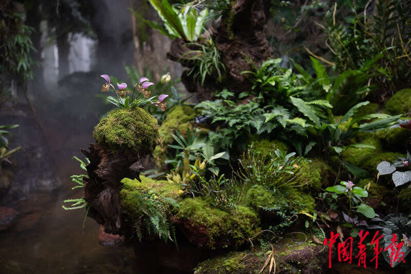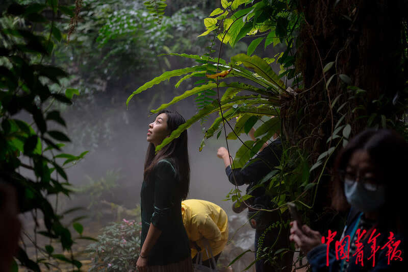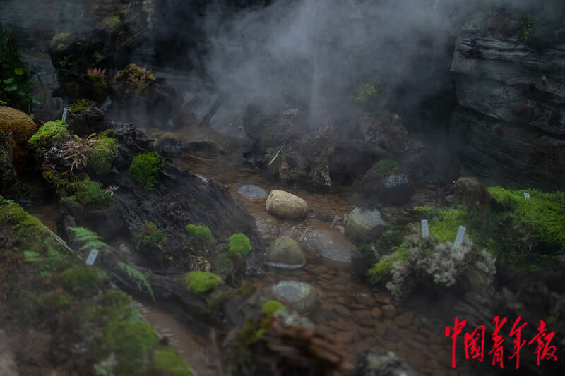 10月14日,云南昆明,中科院昆明植物研究所昆明植物園的“扶荔宮”生物多樣性體驗(yàn)園,展館內(nèi)的地衣、苔蘚植物。為了保證館內(nèi)熱帶植物的濕度,周圍不斷有加濕的噴霧噴出。中青報·中青網(wǎng)記者 李雋輝/攝