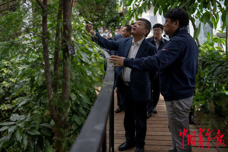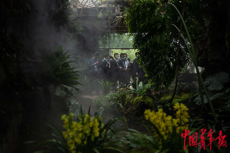 10月14日,云南昆明,中科院昆明植物研究所昆明植物園的“扶荔宮”生物多樣性體驗(yàn)園,生態(tài)環(huán)境部部長黃潤秋(前右二)在館內(nèi)參觀。中青報·中青網(wǎng)記者 李雋輝/攝