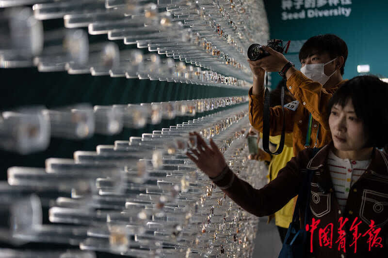 10月14日,云南昆明,中科院昆明植物研究所昆明植物園的“扶荔宮”生物多樣性體驗(yàn)園,記者們在種子博物館展區(qū)參觀。中青報·中青網(wǎng)記者 李雋輝/攝