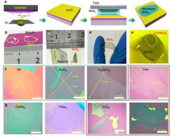 機(jī)械解理獲得多種大面積高質(zhì)量超薄二維材料。(a)新型機(jī)械解理的步驟;(b-e)不同基底上解理得到的大面積MoS2;(f-g)解理得到的多種大面積二維材料。