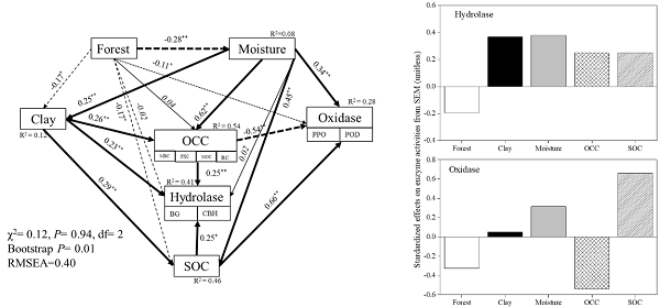 圖2.結(jié)構(gòu)方程模型揭示驅(qū)動土壤有機碳變化的關(guān)鍵因子及其相對貢獻