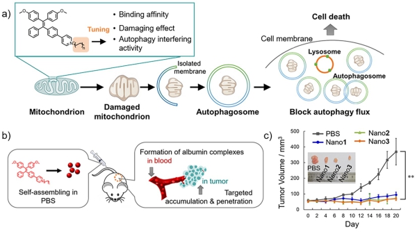 近日,課題組合作設(shè)計(jì)合成具有不同長(zhǎng)度烷基側(cè)鏈的四苯乙烯吡啶鹽分子,發(fā)現(xiàn)這些分子可與血液中的白蛋白自發(fā)組裝形成復(fù)合物,并通過血液循環(huán)靶向定位到腫瘤組織。進(jìn)一步研究發(fā)現(xiàn),隨著烷基鏈長(zhǎng)度的增加,分子與白蛋白(albumin)疏水空腔的結(jié)合力增強(qiáng),對(duì)腫瘤細(xì)胞的線粒體定位能力也增強(qiáng)。更為重要的是,分子定位到線粒體后對(duì)線粒體產(chǎn)生氧化損傷,導(dǎo)致線粒體發(fā)生腫脹變形。生物透射電鏡和熒光自噬指示分析證明,分子不僅導(dǎo)致腫瘤細(xì)胞內(nèi)自噬小體(autophagosome)的累積,而且抑制了自噬小體與溶酶體的融合,使自噬通路受阻,最終導(dǎo)致腫瘤細(xì)胞死亡。利用荷瘤小鼠模型,該研究示蹤定位了分子穿透到腫瘤內(nèi)部進(jìn)行富集的特點(diǎn),通過自噬干預(yù)的新途徑,對(duì)高惡性度的腦腫瘤實(shí)現(xiàn)了有效抑制。