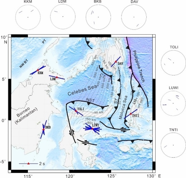 該研究利用遠(yuǎn)震SKS震相分裂計(jì)算,獲得環(huán)蘇拉威西海周圍地區(qū)的7個地震臺站下方的上地幔各向異性參數(shù)(快波偏振方向和快慢波延遲時間)。研究顯示,Halmahera島弧之上的TNTI臺站的快波方向?yàn)闁|北-西南(NE–SW),傾斜于海溝和板片俯沖方向。研究認(rèn)為,在雙向的Sangihe和Halmahera俯沖帶之間的板下地幔中存在由南向北的地幔流,而該研究中臺站TNTI的各向異性主要來源于Halmahera弧前下方的板下地幔流,是受到上述由南向北的地幔流以及向東俯沖的板片與板下地幔耦合產(chǎn)生的地幔流的疊加影響。位于Sangihe板片南北邊緣的LUWI和DAV臺站的各向異性方向反映了俯沖板塊邊緣效應(yīng)引起的上地幔環(huán)繞板塊邊緣的流動。TOLI臺站的各向異性主要貢獻(xiàn)來源于深俯沖的Sangihe板塊引起的地幔楔對流,其影響范圍一直到Borneo(婆羅洲)東北角的LDM臺站(其快波方向平行于Sangihe板片的俯沖方向)。KKM臺站的各向異性為古南海板片俯沖引起的上地幔流動。BKB臺站的快波方向垂直于Java海溝的走向,對應(yīng)著Java俯沖帶弧后的大地幔楔對流。