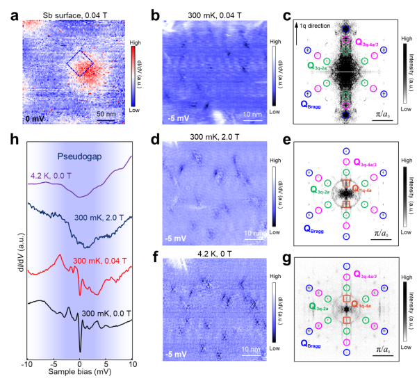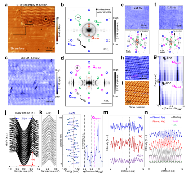 近日,中國(guó)科學(xué)院物理研究所高鴻鈞研究團(tuán)隊(duì)副研究員陳輝、楊海濤與博士研究生胡彬等,利用該團(tuán)隊(duì)自主設(shè)計(jì)組裝的、居國(guó)際頂尖水平的極低溫強(qiáng)磁場(chǎng)掃描隧道顯微鏡/譜(STM/S)聯(lián)合系統(tǒng),對(duì)籠目超導(dǎo)體CsV3Sb5開展了精確和系統(tǒng)研究。該團(tuán)隊(duì)與美國(guó)波士頓學(xué)院教授汪自強(qiáng)、以色列科學(xué)研究所教授顏炳海、中國(guó)人民大學(xué)教授雷和暢、物理所研究員董曉莉等合作。研究人員合成了高質(zhì)量的新型層狀籠目結(jié)構(gòu)超導(dǎo)體CsV3Sb5??蒲腥藛T利用STM/S,實(shí)驗(yàn)發(fā)現(xiàn),觀察到兩種2a0′2a0和單向條紋4a0 電荷密度波共存的非常規(guī)超導(dǎo)態(tài),并證實(shí)其具有smectic超導(dǎo)序;觀察到不同于普通超導(dǎo)體中的配對(duì)密度波,這種配對(duì)密度波與超流態(tài)中的旋子(roton)激發(fā)態(tài)行為類似;觀察到該配對(duì)密度波可以誘導(dǎo)產(chǎn)生具有相同空間調(diào)制的電荷密度波,其對(duì)應(yīng)著±5 meV能量位置的“贗能隙”(pseudogap),可以在Tc以上的溫度(4 K)和HC2以上的磁場(chǎng)(2T)觀測(cè)到;觀察到非超導(dǎo)態(tài)下的非相干的配對(duì)密度波以及相干情況下超導(dǎo)和配對(duì)密度波之間的耦合。這些配對(duì)密度波的性質(zhì)不同于銅基高溫超導(dǎo)體中的配對(duì)密度波性質(zhì),預(yù)示著這類籠目超導(dǎo)體中有著新穎的配對(duì)密度波形成機(jī)制。
