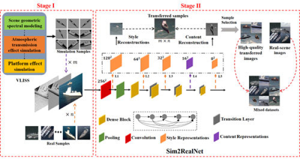 中國(guó)科學(xué)院國(guó)家空間科學(xué)中心復(fù)雜航天系統(tǒng)電子信息技術(shù)院重點(diǎn)實(shí)驗(yàn)室研究員李立鋼團(tuán)隊(duì)碩士研究生肖奇結(jié)合非合作目標(biāo)智能分類(lèi)的應(yīng)用場(chǎng)景,提出了一種漸進(jìn)式的光學(xué)遙感目標(biāo)高價(jià)值圖像樣本數(shù)據(jù)擴(kuò)增生成方法。該方法將整個(gè)數(shù)據(jù)擴(kuò)增流程分為樣本仿真生成階段和風(fēng)格遷移階段:在樣本仿真生成階段,基于物理仿真工具預(yù)先生成多樣化類(lèi)型的目標(biāo)仿真圖像樣本,樣本類(lèi)型覆蓋目標(biāo)典型探測(cè)角度、探測(cè)能見(jiàn)度以及成像分辨率等,這一階段的主要目的在于提高原始目標(biāo)數(shù)據(jù)集的特征豐富度;在風(fēng)格遷移階段,通過(guò)構(gòu)建風(fēng)格遷移網(wǎng)絡(luò)Sim2RealNet,Sim2RealNet以Densenet-121為主干網(wǎng)絡(luò),能夠有效地提取仿真樣本和真實(shí)圖像內(nèi)容信息和風(fēng)格信息,從而實(shí)現(xiàn)從仿真樣本到真實(shí)樣本的風(fēng)格遷移處理,該階段的主要目的在于減少仿真樣本與真實(shí)樣本之間的域差異,整個(gè)數(shù)據(jù)擴(kuò)增的處理流程如圖1所示。為了驗(yàn)證該研究提出的方法有效性,科研人員針對(duì)六類(lèi)目標(biāo)開(kāi)展了兩組光學(xué)遙感目標(biāo)分類(lèi)實(shí)驗(yàn),第一組分別利用傳統(tǒng)圖像變換數(shù)據(jù)擴(kuò)增、圖像仿真數(shù)據(jù)擴(kuò)增以及本文提出的漸進(jìn)式數(shù)據(jù)擴(kuò)增方法開(kāi)展樣本擴(kuò)增及分類(lèi)模型訓(xùn)練,具體分類(lèi)結(jié)果如圖2所示;第二組對(duì)傳統(tǒng)圖像變換數(shù)據(jù)擴(kuò)增、圖像仿真數(shù)據(jù)擴(kuò)增以及本文提出的漸進(jìn)式數(shù)據(jù)擴(kuò)增方法進(jìn)行組合樣本擴(kuò)增及分類(lèi)模型訓(xùn)練,具體分類(lèi)結(jié)果如圖3所示。第一組實(shí)驗(yàn)結(jié)果表明,與現(xiàn)有數(shù)據(jù)擴(kuò)增方法相比,該研究提出的方法能夠使得光學(xué)遙感目標(biāo)分類(lèi)準(zhǔn)確度平均提高5%;第二組實(shí)驗(yàn)結(jié)果表明,通過(guò)將本文提出的數(shù)據(jù)擴(kuò)增方法與其他方法進(jìn)行組合數(shù)據(jù)擴(kuò)增,與單一使用現(xiàn)有方法擴(kuò)增,光學(xué)遙感目標(biāo)分類(lèi)準(zhǔn)確度仍可提高6%,表明本研究提出的漸進(jìn)式數(shù)據(jù)擴(kuò)增方法在使用上具有較強(qiáng)的魯棒性。