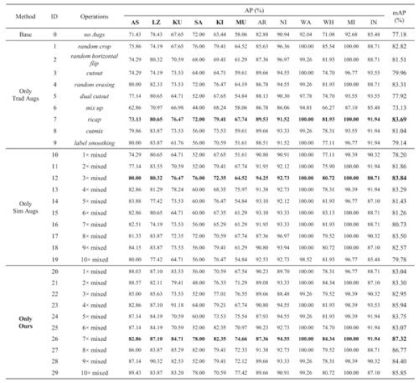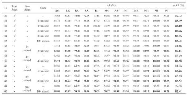 圖3.對(duì)比試驗(yàn)二:傳統(tǒng)圖像變換數(shù)據(jù)擴(kuò)增、圖像仿真數(shù)據(jù)擴(kuò)增分別與本文方法聯(lián)合使用實(shí)驗(yàn)結(jié)果