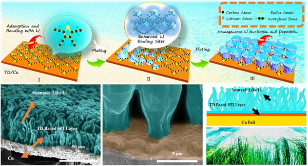 在上述研究基礎(chǔ)上,該研究組進(jìn)一步運(yùn)用分子結(jié)構(gòu)設(shè)計(jì),將具有較大電負(fù)性和親鋰作用的含硫噻吩官能團(tuán)與炔鍵相連,報(bào)道了一種利用誘導(dǎo)沉積的方法直接在集流體表面實(shí)現(xiàn)可控制備薄層海藻狀金屬鋰負(fù)極以提高鋰金屬電池循環(huán)穩(wěn)定性的方法。研究將具有較大電負(fù)性和親鋰作用的含硫噻吩官能團(tuán)與炔鍵相連,實(shí)現(xiàn)噻吩炔表面鋰金屬的均勻成核和生長(zhǎng),并形成由單個(gè)金屬鋰棒生成的海藻狀金屬鋰薄層。研究通過理論計(jì)算明確噻吩炔中均勻分布的硫原子與炔鍵形成的協(xié)同效應(yīng)增強(qiáng)鋰與成核活性位點(diǎn)之間的相互作用,優(yōu)化整個(gè)碳骨架區(qū)對(duì)于鋰的均勻吸附能力,利用硫原子調(diào)控電荷在鋰與噻吩炔界面的轉(zhuǎn)移與傳輸性能,降低鋰的成核過電勢(shì)從而誘導(dǎo)鋰均勻成核。結(jié)果表明,海藻狀薄層金屬鋰與銅箔上直接沉積的塊狀金屬鋰相比,體現(xiàn)出較低的成核過電勢(shì)與界面阻抗,并在對(duì)稱金屬鋰電池中表現(xiàn)出優(yōu)異的循環(huán)穩(wěn)定性。由海藻狀鋰金屬負(fù)極和Li4Ti5O12作為正極組裝的全電池在1000多個(gè)循環(huán)中具有優(yōu)異的容量保持率。