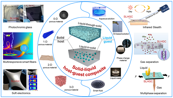 近期,該團(tuán)隊(duì)在Advanced Materials上發(fā)表文章,系統(tǒng)綜述固液主客體復(fù)合材料的最新進(jìn)展和未來研究方向:首先,介紹了固液主客體復(fù)合材料的概念、分類、設(shè)計(jì)策略(包括材料設(shè)計(jì)、維度設(shè)計(jì)、連續(xù)性設(shè)計(jì)、尺寸效應(yīng)和響應(yīng)性),以及制備方法。其次,闡述了如何借助多孔固體材料和功能液體材料固有屬性,來獲得固液主客體復(fù)合材料的各種優(yōu)異性能,特別是在光學(xué)、熱學(xué)、電學(xué)、機(jī)械、吸附和分離等方面的性能,并進(jìn)一步展示固液主客體復(fù)合材料在光學(xué)器件、熱管理、電磁屏蔽、柔性電子、氣體吸附以及多相分離等領(lǐng)域的應(yīng)用。最后,展望了固液主客體復(fù)合材料的未來發(fā)展方向,評(píng)述了目前所面臨的挑戰(zhàn)和未來的發(fā)展機(jī)遇。