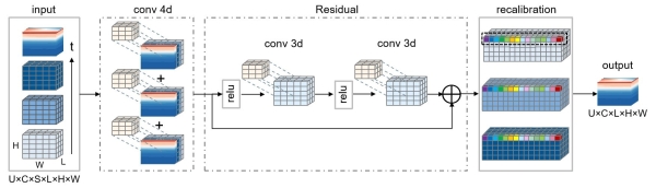 沈陽(yáng)自動(dòng)化所數(shù)字工廠研究室大數(shù)據(jù)課題組提出一種基于時(shí)空四維卷積網(wǎng)絡(luò)的模型。該模型由四維卷積網(wǎng)絡(luò)、殘差網(wǎng)絡(luò)、再校準(zhǔn)模塊三部分構(gòu)成。研究利用四維卷積將海洋溫度同時(shí)從立體空間、時(shí)間維度提取雙重特征;之后緊接殘差單元,利用三維卷積進(jìn)一步探索海洋的空間特征;運(yùn)用再校準(zhǔn)模塊,探索、量化各個(gè)區(qū)域特征的貢獻(xiàn)程度,由此提高模型的質(zhì)量。實(shí)驗(yàn)表明,該模型對(duì)海洋0-2000m的水平及剖面預(yù)測(cè)均取得了高精度結(jié)果,溫躍層的位置及形狀也可準(zhǔn)確捕捉。科研人員將其與主流算法對(duì)比,在均方根誤差(RMSE)、平均絕對(duì)誤差(MAE)、預(yù)測(cè)精度(ACC)、決定系數(shù)(R-Square)等指標(biāo)上均為最優(yōu)。