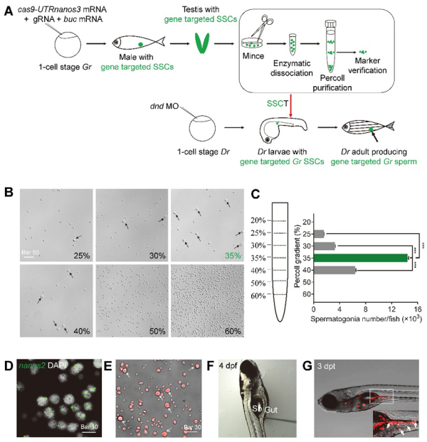 前期研究中,孫永華團(tuán)隊(duì)在斑馬魚中建立并優(yōu)化了魚類基因編輯配子的“借腹生殖”技術(shù)(J Genet Genomics,2020;Faculty of 1000推薦),快速而高效地獲得了純合突變致死基因的母源合子突變體,為斑馬魚母源基因的功能研究開辟了新途徑。為進(jìn)一步探究在魚類異種間能否建立基因編輯配子的“借腹生殖”技術(shù),該團(tuán)隊(duì)選擇了跨亞科的兩個(gè)魚類物種——稀有鮈鯽和斑馬魚作為SSCT供體和受體,將生殖細(xì)胞靶向的CRISPR/Cas9基因編輯和SSCT“借腹生殖”技術(shù)進(jìn)行有機(jī)整合和優(yōu)化,利用受體斑馬魚快速、高效地獲得了供體稀有鮈鯽來源的經(jīng)基因編輯的精子(圖1)。
