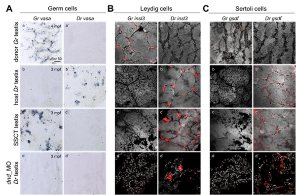 圖2.SSCT精巢由稀有鮈鯽(Gr)的生殖細(xì)胞和斑馬魚(Dr)的性腺體細(xì)胞構(gòu)成