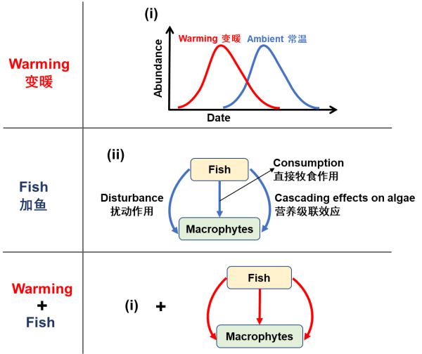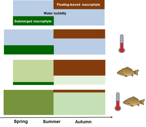 研究發(fā)現(xiàn),氣候變暖提前了菹草的生活周期(17天)。鯉抑制了菹草的生長,但是促進了菱的生長,增加了水體濁度并促進了浮游植物和附著藻的生長,導致生態(tài)系統(tǒng)轉(zhuǎn)變?yōu)榱艘愿∪~植物為主的穩(wěn)態(tài)系統(tǒng)。氣候變暖加劇了鯉對沉水植物的影響,而且抑制了浮葉植物的生長,導致水體濁度進一步升高。