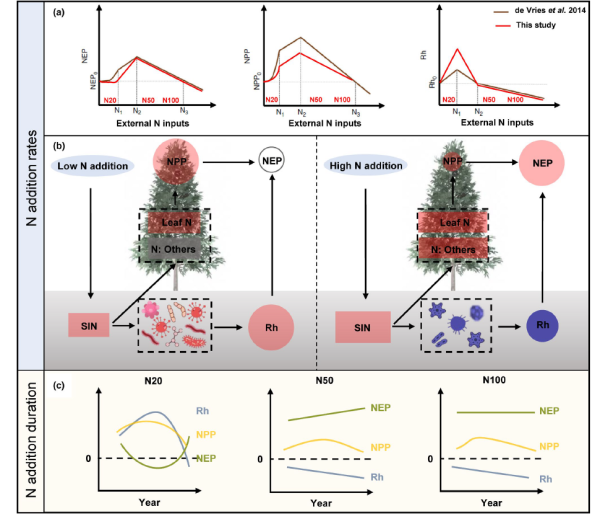 中國科學(xué)院植物研究所研究團隊借助長期野外控制實驗平臺,基于2012-2020年間的樹木生長和土壤異養(yǎng)呼吸連續(xù)觀測數(shù)據(jù),研究了北方森林老齡林生態(tài)系統(tǒng)碳通量對不同氮添加水平的響應(yīng)及隨時間的變化。結(jié)果表明,氮添加促進凈初級生產(chǎn)力,其效應(yīng)大小隨氮添加水平下降;土壤異養(yǎng)呼吸碳排放對不同氮添加水平的響應(yīng)是非線性的,低水平氮添加促進,而中氮和高氮添加抑制。低水平氮添加對凈初級生產(chǎn)力和土壤異養(yǎng)呼吸碳排放的效應(yīng)大小相當(dāng),最終導(dǎo)致低水平氮添加對凈生態(tài)系統(tǒng)生產(chǎn)力沒有影響,而中氮和高氮添加促進生態(tài)系統(tǒng)碳匯。此外,該研究還揭示了低水平氮添加處理對生態(tài)系統(tǒng)碳通量的影響隨時間呈非線性變化。綜上,與“氮沉降促進北方森林生態(tài)系統(tǒng)碳匯”這一傳統(tǒng)觀點不同,該研究發(fā)現(xiàn)低水平氮添加對北方森林生態(tài)系統(tǒng)碳輸入和碳輸出過程的影響相當(dāng),意味著背景氮沉降對北方森林生態(tài)系統(tǒng)碳匯的貢獻微弱。