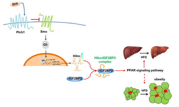 Hh信號通路的激活會誘導Hilnc的表達,Hilnc可以直接與IGF2BP2結合從而調控PPAR信號通路,進而影響高脂誘導的非酒精性脂肪肝或肥胖