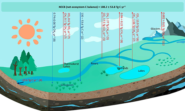 研究發(fā)現(xiàn),高寒草地是重要的CO2和CH4匯,而水體向外界水平輸送的碳是主要潛在流失路徑。河流通過水平運移和垂向釋放(CO2和CH4)共抵消了陸地CO2匯的12.6%,高寒濕地、湖泊、熱融湖塘、冰川等通過碳損失抵消了陸地碳匯的4.2%。綜上,青藏高原陸表水體路徑的碳流失僅抵消高寒生態(tài)系統(tǒng)CO2匯的16.8%,陸地生態(tài)系統(tǒng)CO2匯仍主導區(qū)域凈碳平衡。