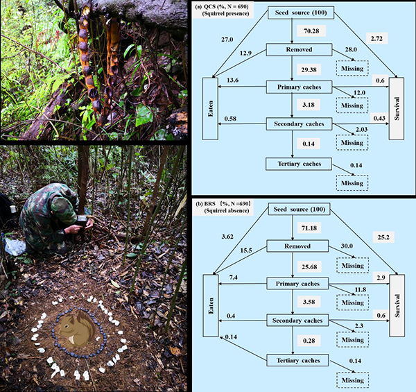 圖2.嚙齒動物對油麻藤種子的取食和傳播(a、松鼠存在區(qū)域;b、松鼠缺失區(qū)域)