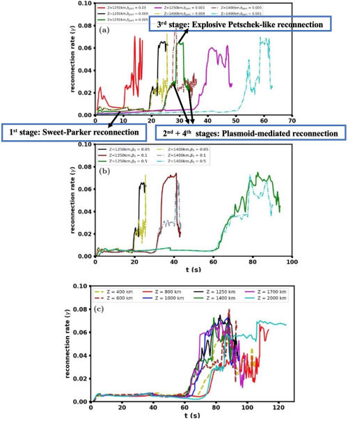 該團(tuán)隊(duì)通過單流體輻射磁流體力學(xué)模擬,探討了在不完全電離的低層太陽大氣(從光球到日冕底部)在不同高度上的動(dòng)態(tài)磁重聯(lián)過程。結(jié)果顯示,在所有模擬案例中,主X點(diǎn)的等離子體溫度和密度在磁重聯(lián)過程中會(huì)出現(xiàn)突然下降的情況,這與強(qiáng)的輻射冷卻、熱等離子體從主X點(diǎn)附近噴射出去或者主X點(diǎn)從熱的、高密度區(qū)域移動(dòng)到冷的、低密度區(qū)域相關(guān)。這一溫度和密度下降導(dǎo)致壓力衰減和X點(diǎn)處磁擴(kuò)散系數(shù)增加,進(jìn)而致使動(dòng)態(tài)Petschek式磁重聯(lián)出現(xiàn)的過程,通常在等離子體團(tuán)從重聯(lián)電流片中噴出后發(fā)生。這展示了在非完全電離的環(huán)境中由等離子體團(tuán)不穩(wěn)定性主導(dǎo)的磁重聯(lián)過渡到爆發(fā)式的更快的動(dòng)態(tài)Petschek式重聯(lián)的物理過程。它的最大速率能夠達(dá)到0.06以上,高于等離子體團(tuán)不穩(wěn)定性主導(dǎo)的磁重聯(lián)速率。這表明,兩種磁重聯(lián)模式的交替出現(xiàn)改善了能量轉(zhuǎn)換效率,并提高了磁重聯(lián)速率。