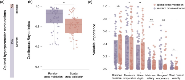 該研究通過(guò)隨機(jī)交叉驗(yàn)證與空間交叉驗(yàn)證方法,以海洋近海典型魚(yú)類——羊魚(yú)為對(duì)象,進(jìn)行模型的參數(shù)優(yōu)化和性能評(píng)估。研究發(fā)現(xiàn),兩種交叉驗(yàn)證方法在95%的物種中得出不同的最佳模型參數(shù)組合,并在預(yù)測(cè)當(dāng)前和未來(lái)的棲息地分布方面存在差異。隨機(jī)交叉驗(yàn)證方法在預(yù)測(cè)性能上可能存在過(guò)高估計(jì)的風(fēng)險(xiǎn),而空間交叉驗(yàn)證方法傾向于保守。