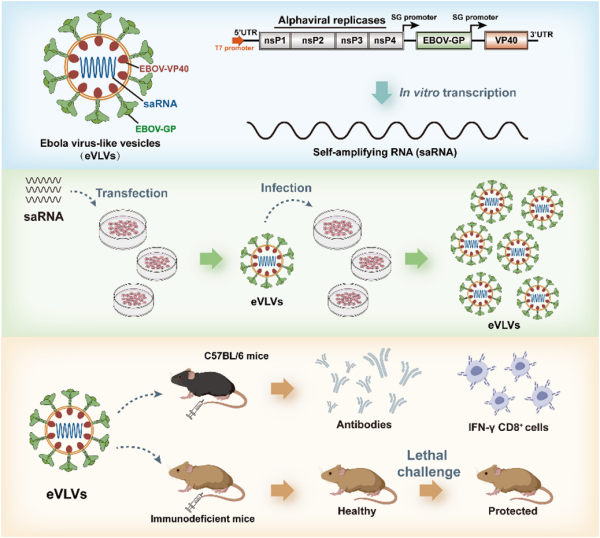 該研究利用基于甲病毒自復制RNA的病毒樣囊泡(VLVs)新型疫苗策略,構(gòu)建了編碼表達埃博拉病毒關(guān)鍵抗原蛋白的疫苗候選株eVLVs。研究發(fā)現(xiàn),eVLVs可在體外自主復制擴增,穩(wěn)定表達EBOV糖蛋白GP與基質(zhì)蛋白VP40,具備良好的抗原性。進一步,動物評價結(jié)果表明,相較于已批準上市的VSV-EBOV減毒活疫苗,eVLVs展現(xiàn)出更高的安全性,即感染接種免疫缺陷小鼠未引發(fā)顯著的臨床疾病。同時,eVLVs免疫可刺激小鼠同時產(chǎn)生高水平的EBOV特異性抗體與IFN-γ CD8+ T細胞免疫應答;單次免疫eVLVs可為替代小鼠模型提供完全的攻毒保護作用,使其免受病毒的致死感染。