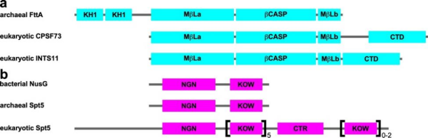 古菌轉(zhuǎn)錄終止因子FttA又稱aCPSF1。FttA是真核生物整合子復(fù)合物中INTS11亞基和切割與加聚腺苷酸特異性因子復(fù)合物中CPSF73亞基的同源蛋白,負(fù)責(zé)古菌中多數(shù)轉(zhuǎn)錄單元的轉(zhuǎn)錄終止。FttA具有核糖核酸內(nèi)切酶活性和5'→3'核糖核酸外切酶活性。同時(shí),唯一在三域內(nèi)保守的轉(zhuǎn)錄因子Spt5能夠促進(jìn)FttA的轉(zhuǎn)錄終止活性。然而,F(xiàn)ttA如何介導(dǎo)古菌RNA聚合酶的轉(zhuǎn)錄終止以及Spt5如何促進(jìn)轉(zhuǎn)錄終止的機(jī)制尚不清楚。