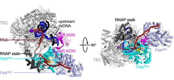 該研究利用體外RNA切割和解離實(shí)驗(yàn),確認(rèn)了各個(gè)組分可以組裝成具有轉(zhuǎn)錄終止活性的復(fù)合物。由于轉(zhuǎn)錄終止的過程動(dòng)態(tài)且不穩(wěn)定,為了捕捉穩(wěn)定的轉(zhuǎn)錄終止復(fù)合物,研究使用突變的FttA蛋白進(jìn)行復(fù)合物組裝,并通過單顆粒冷凍電鏡方法解析了分辨率為2.2?-2.5?的轉(zhuǎn)錄終止復(fù)合物結(jié)構(gòu)。結(jié)構(gòu)表明,F(xiàn)ttA結(jié)合在RNA退出通道的外側(cè),使RNA可以直接從RNA聚合酶退出通道而進(jìn)入FttA的切割活性中心。Spt5在FttA與轉(zhuǎn)錄延伸復(fù)合物(TEC)之間發(fā)揮橋梁作用,其N端結(jié)構(gòu)域結(jié)合RNA聚合酶,C端結(jié)構(gòu)域結(jié)合FttA,解釋了Spt5如何促進(jìn)FttA介導(dǎo)的轉(zhuǎn)錄終止。FttA以二聚體形式發(fā)揮作用,而FttAprox和FttAdist在功能上不同。FttAprox負(fù)責(zé)執(zhí)行終止所需的RNA切割,而FttAdist提供支持,通過擴(kuò)展與mRNA的相互作用面,增強(qiáng)序列U的選擇性和終止復(fù)合物的穩(wěn)定性。FttA的二聚體形式增強(qiáng)了其RNA切割活性。FttA利用核糖核酸內(nèi)切酶活性對(duì)mRNA進(jìn)行切割,進(jìn)而利用外切酶活性進(jìn)行5'→3'切割mRNA,并沿著mRNA進(jìn)行5'→3'轉(zhuǎn)位,從而對(duì)TEC施加機(jī)械力,引發(fā)轉(zhuǎn)錄終止。