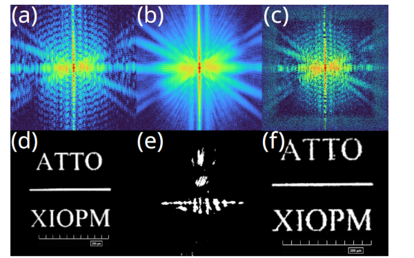 (a)(d)窄帶光相干衍射成像;(b)(e)寬帶光衍射圖樣直接反演結(jié)果;(c)(f)單色化方法實現(xiàn)的寬帶光相干衍射成像