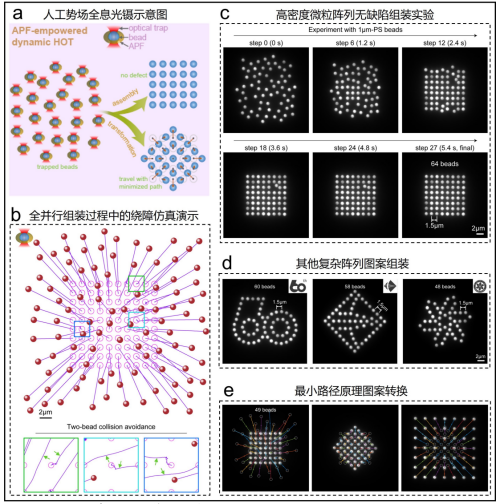 該團(tuán)隊受無人機(jī)集群控制和水下機(jī)器人隊列操縱技術(shù)啟發(fā),提出了人工勢場全息光鑷,解決了多微粒動態(tài)光學(xué)微操控過程中粒子間相互碰撞問題,實(shí)現(xiàn)了微粒集群的全并行最優(yōu)路徑控制和結(jié)構(gòu)組裝。這一技術(shù)通過人工智能算法為光阱中的微粒額外添加虛擬排斥場(排斥作用力與微粒間距成反比),使微粒在碰撞即將發(fā)生時通過局部位移繞過障礙。研究顯示,基于這一技術(shù),可通過全額并行操控實(shí)現(xiàn)對微粒陣列的無缺陷組裝,使組裝效率最大化,同時通過匈牙利算法得到的最小路徑優(yōu)化方案可以實(shí)現(xiàn)不同圖案間的轉(zhuǎn)換。