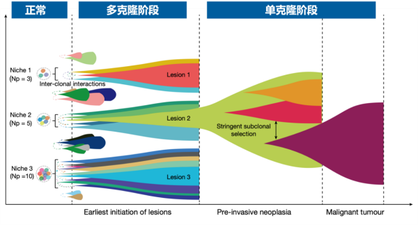 惡性腫瘤是人類面臨的健康威脅之一,而腫瘤最初如何形成尚不清楚。Peter Nowell克隆演化理論提出,癌細胞由人體內(nèi)正常細胞因基因變異逐漸轉(zhuǎn)變而來。這一過程經(jīng)過不斷的細胞分裂和突變,導(dǎo)致克隆性擴增,并在不斷克隆篩選作用下形成腫瘤。盡管這一理論已成為科學(xué)界的普遍共識,但存在一個懸而未決的問題,即在腫瘤形成的最初階段,是一個發(fā)生致癌突變的細胞(單克隆起源)還是多個異常細胞(多克隆起源)同時充當腫瘤“原始祖先”。