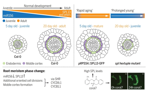 11月15日,中國科學院遺傳與發(fā)育生物學研究所楊寶軍團隊和荷蘭根特大學Bert De Rybel研究組合作,在《科學》(Science)上在線發(fā)表了題為SPL13 controls a root apical meristem phase change by triggering oriented cell divisions的研究論文。該研究揭示了根系形態(tài)的時空變化過程及背后的分子機制。研究建立了植物細胞分裂方向篩選系統(tǒng)并測試了超過15000個化合物,獲得了可影響植物細胞分裂方向變化的小分子化合物coral7。進一步,研究發(fā)現(xiàn),coral7通過影響轉(zhuǎn)錄因子SPL13的表達調(diào)控細胞分裂方向。這一研究揭示了SPL類轉(zhuǎn)錄因子可以通過影響細胞分裂方向控制根分生組織的形態(tài)特征和時空變化,為重塑植物根系形態(tài)提供了重要策略。