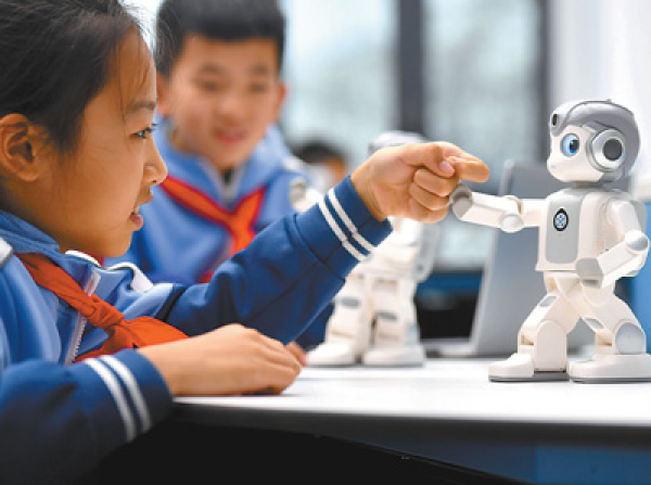 在河北省石家莊市融創(chuàng)中心第一小學,學生與人工智能設(shè)備進行互動。張曉峰攝
